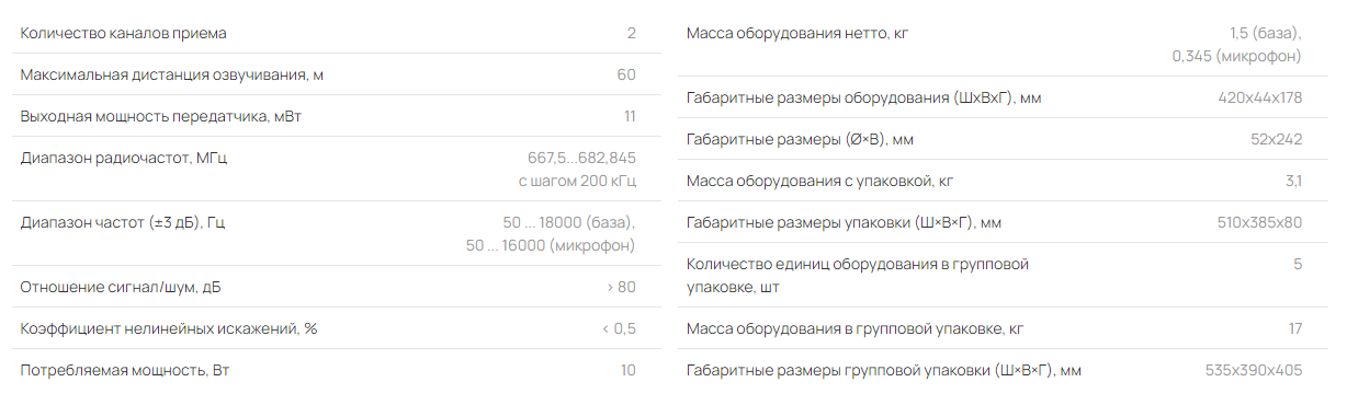 КОМПЛЕКТАЦИЯ: Приёмник двухканальный 1шт., антенна 2 шт., ручной радиомикрофон 2шт., сетевой адаптер для приемника, шнур Jack 6.3 - Jack 6.3, противоскользящее кольцо для микрофона 2шт., руководство пользователя